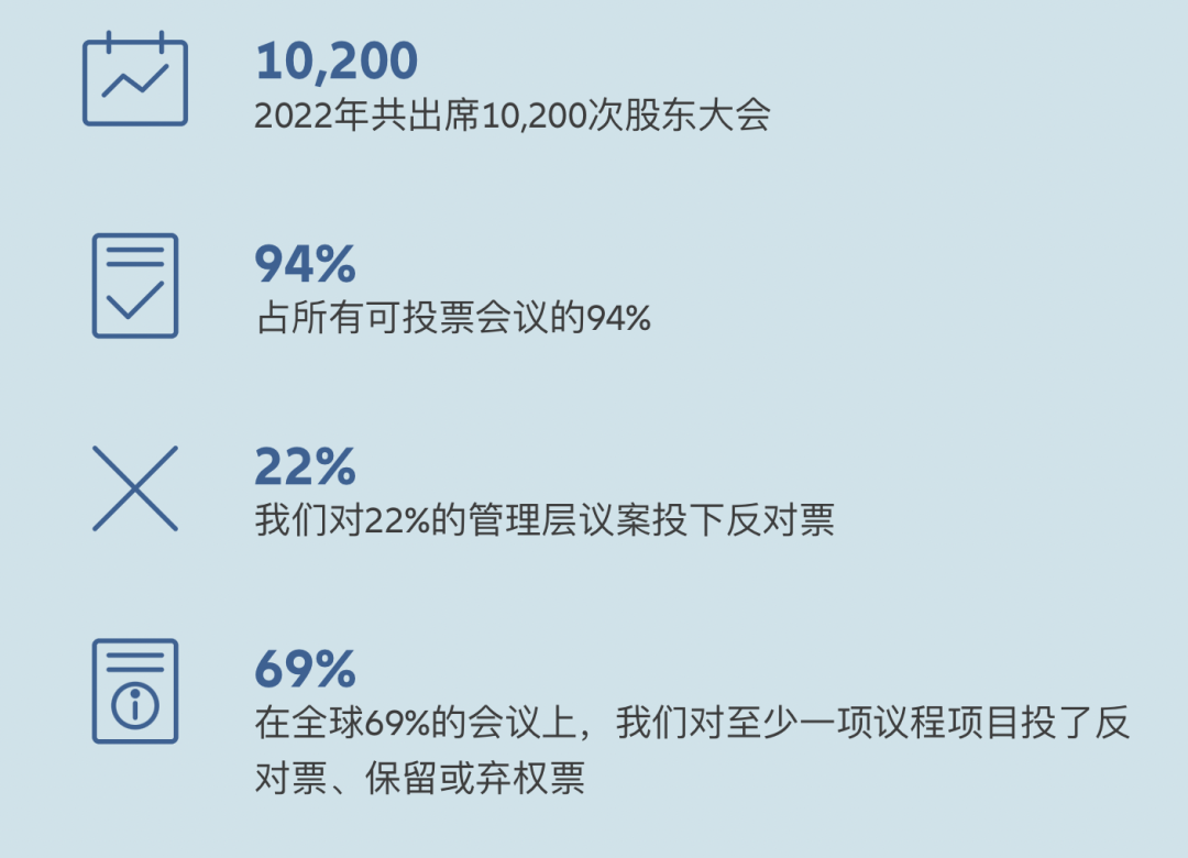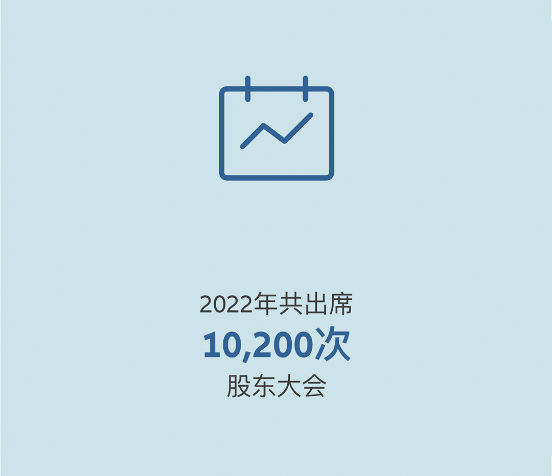 ● 我们在2022年共出席10,200次股东大会。重点议题包括董事会选举、高级管理人员薪酬、资本结构相关的授权,以及外部审计师任命。