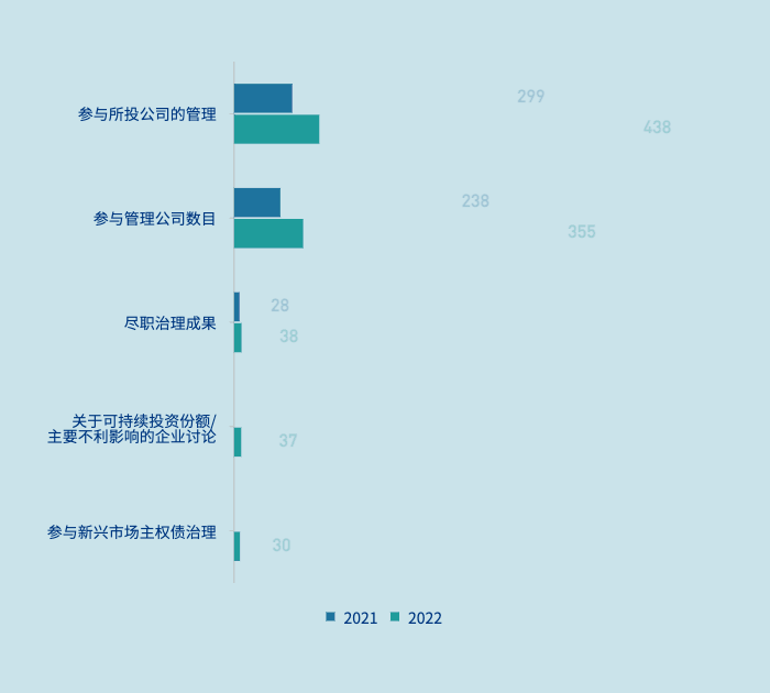 ● 我们在2022年显著扩大了我们的参与,针对我们的三个主题加上管治主题,采取主题性的合作方式,参与了位于28个国家或地区的355家公司的管理。
